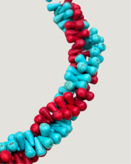 Bright red and aqua stones give the Italia Choker a sharp, modern contrast. Each bead is hand-selected and the piece is carefully handmade. Designed to sit close to the neck or be worn with a looser fit, it’s a bold yet easy accent for any look.